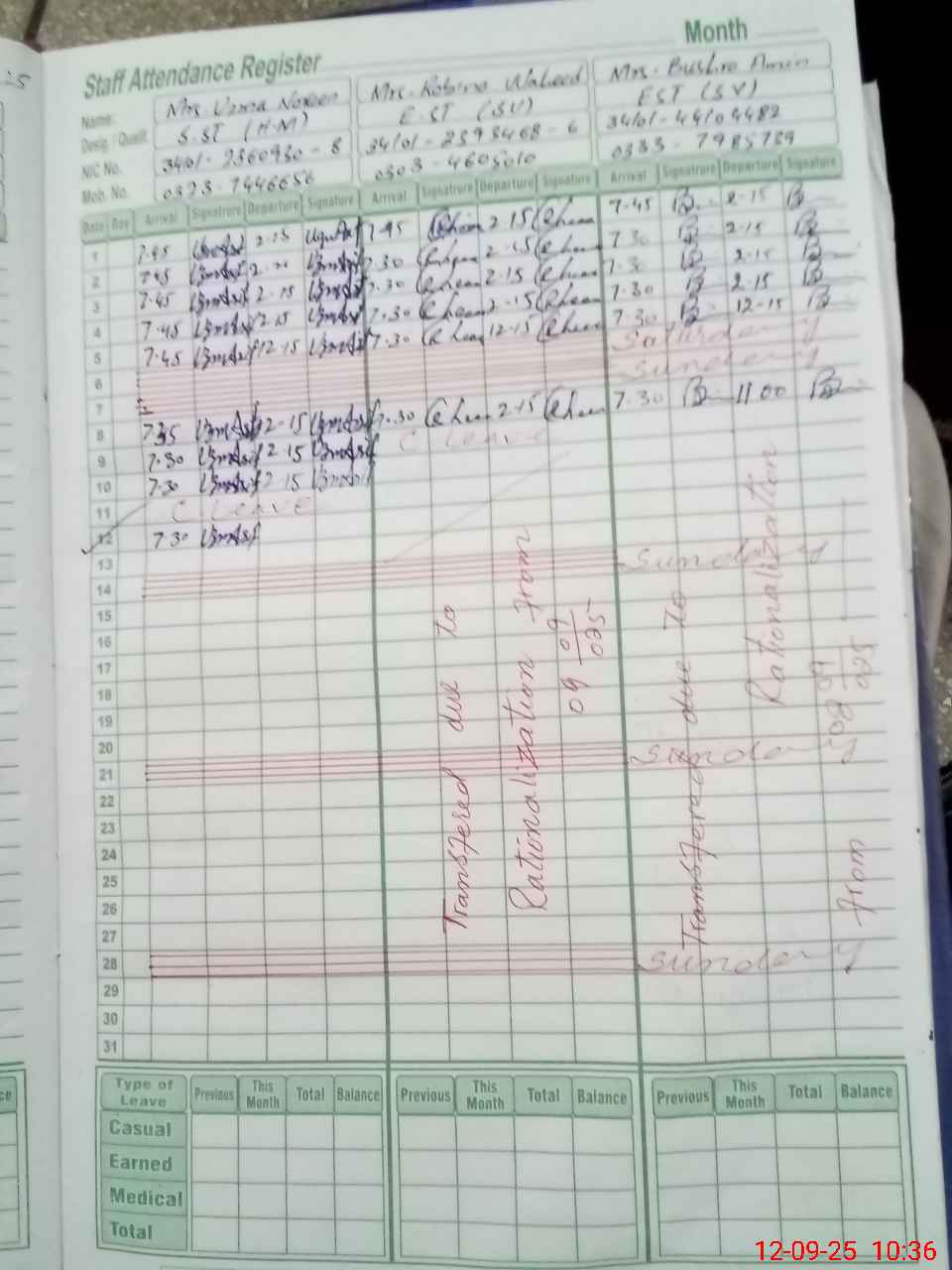 | CNIC | Full Name | Designation | R/C | Absence During Last Calender Month |