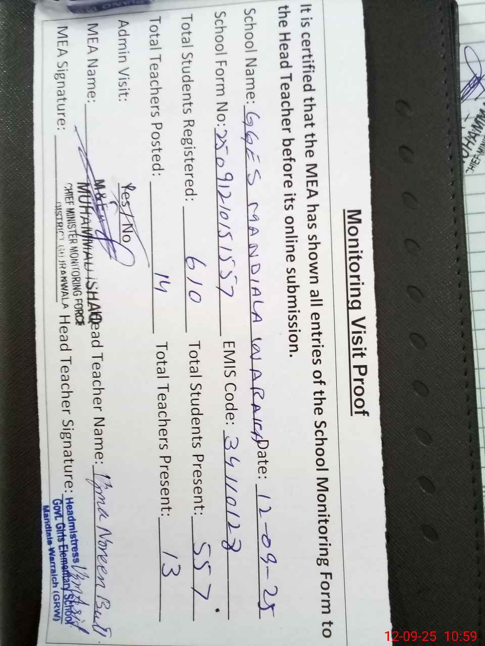 | Attendance Register | Head Teacher | MEA with School | Visit Proof |