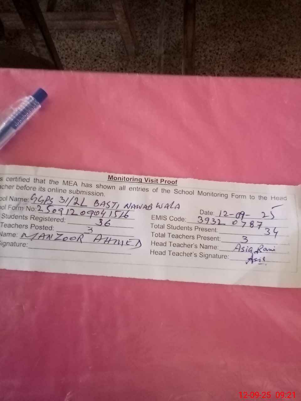 | Attendance Register | Head Teacher | MEA with School | Visit Proof |