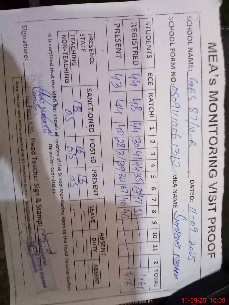 | Attendance Register | Head Teacher | MEA with School | Visit Proof |
