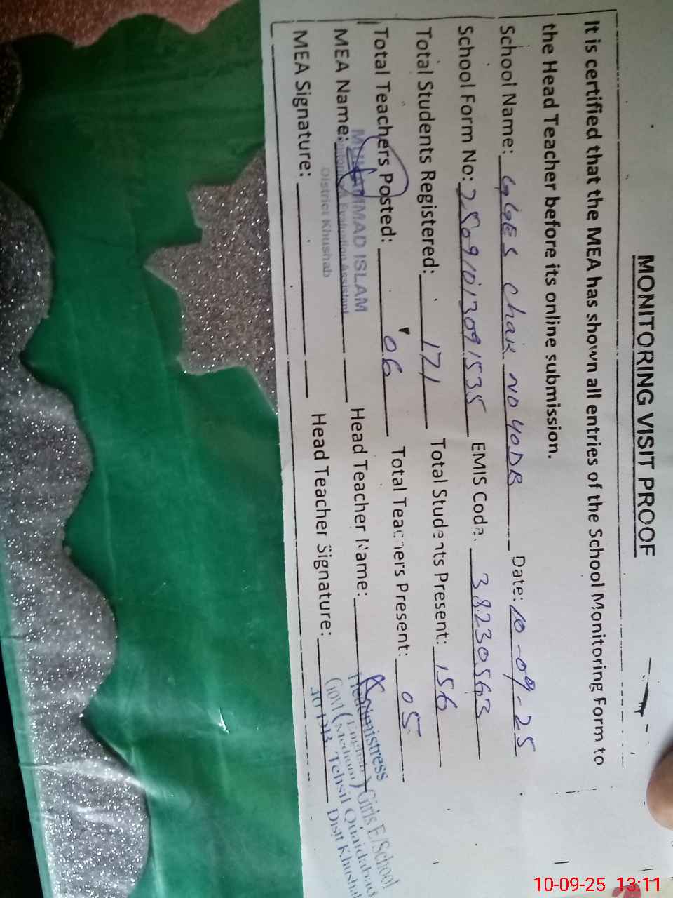 | Attendance Register | Head Teacher | MEA with School | Visit Proof |
