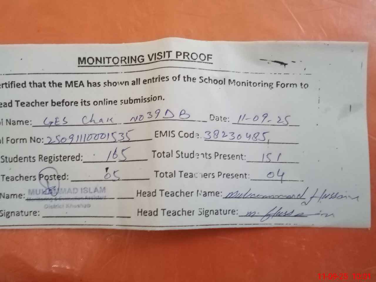 | EMIS Code: 38230485 | Name of School: GES CHAK NO. 39 DB | |||
