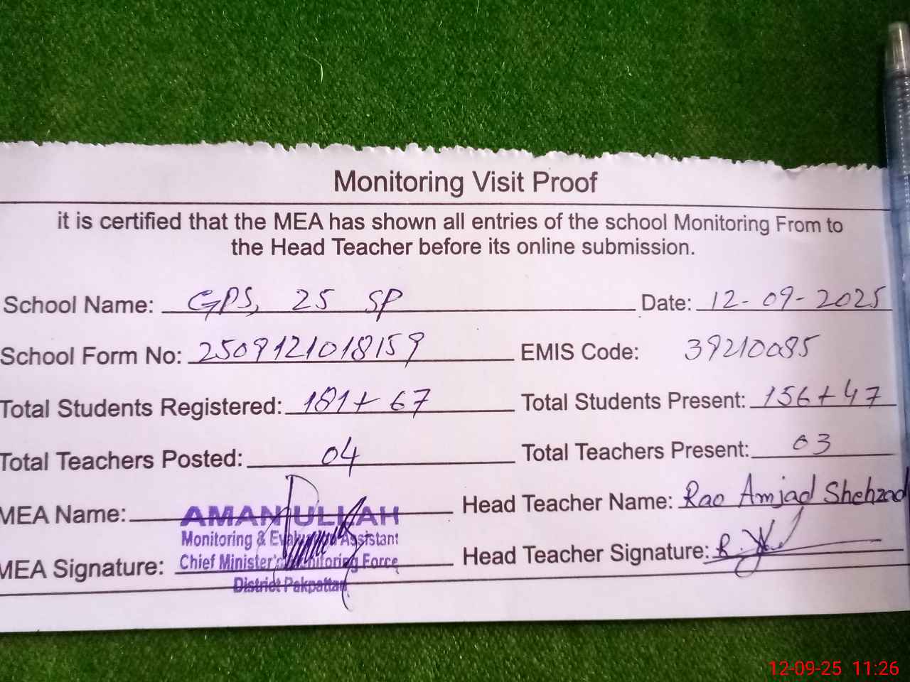 | Attendance Register | Head Teacher | MEA with School | Visit Proof |
