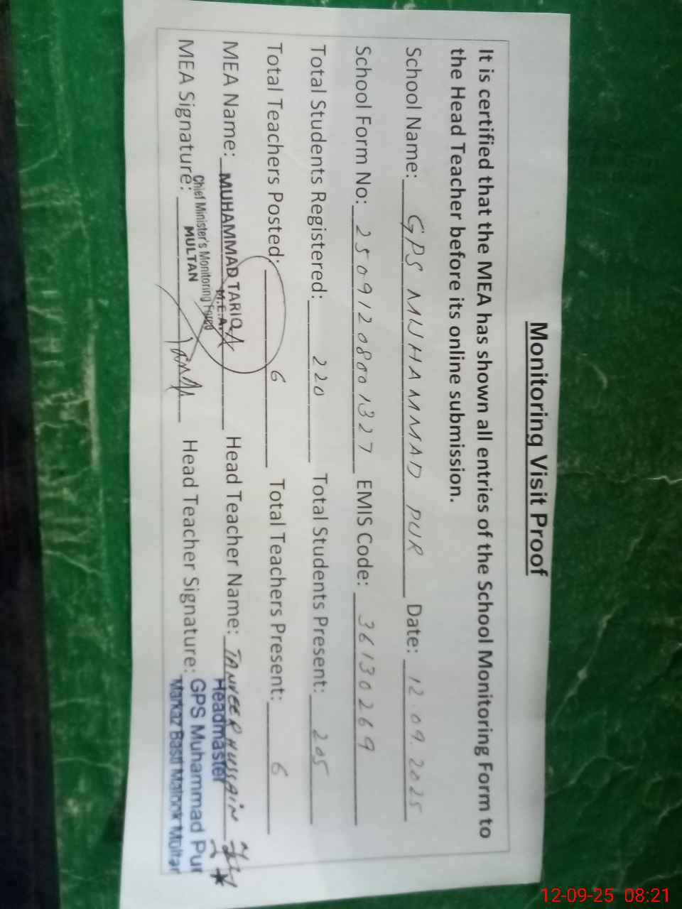 | EMIS Code: 36130269 | Name of School: GPS MUHAMMAD PUR | |||