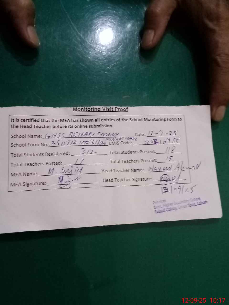 | EMIS Code: 35210955 | Name of School: GHSS BEHARI COLONY MUSLIM CHOWK GREEN TOWN | |||