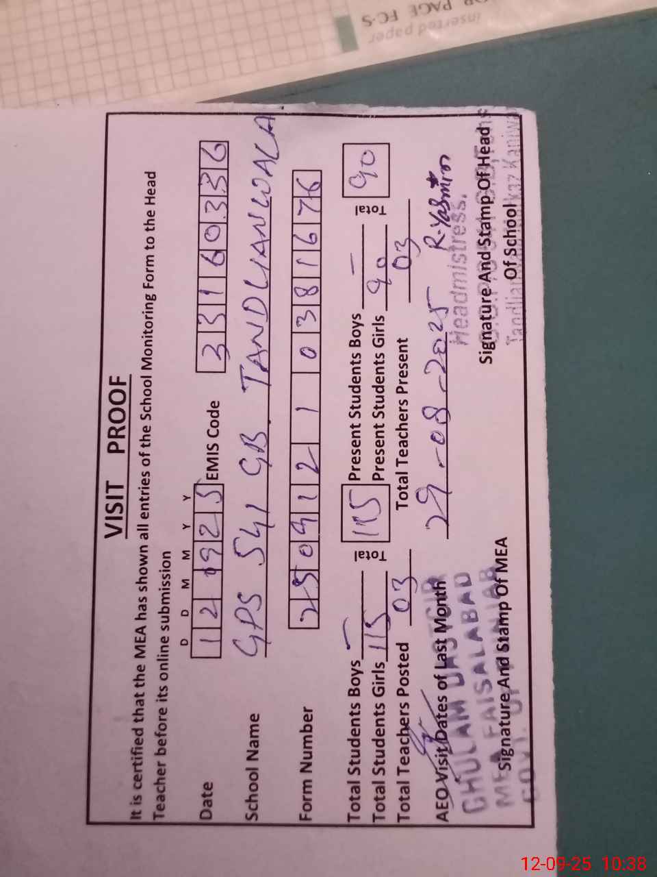 | Attendance Register | Head Teacher | MEA with School | Visit Proof |