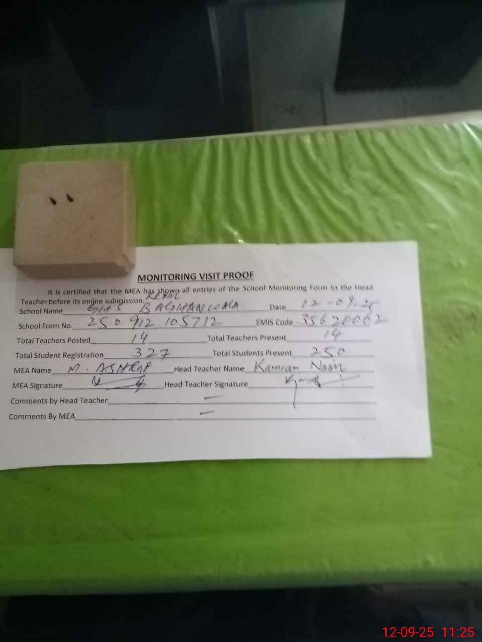 | Attendance Register | Head Teacher | MEA with School | Visit Proof |