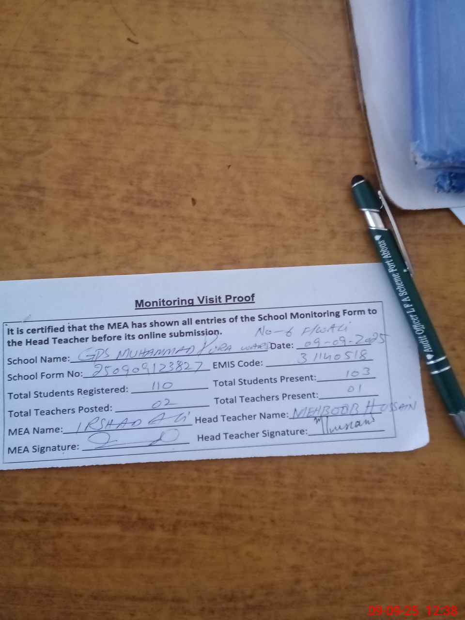 | Attendance Register | Head Teacher | MEA with School | Visit Proof |