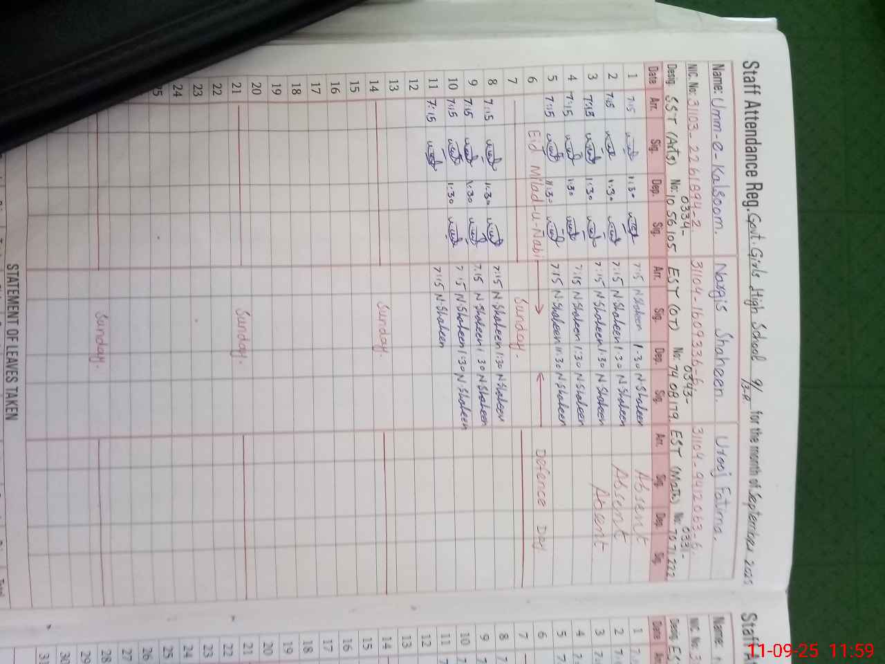 | CNIC | Full Name | Designation | R/C | Absence During Last Calender Month |