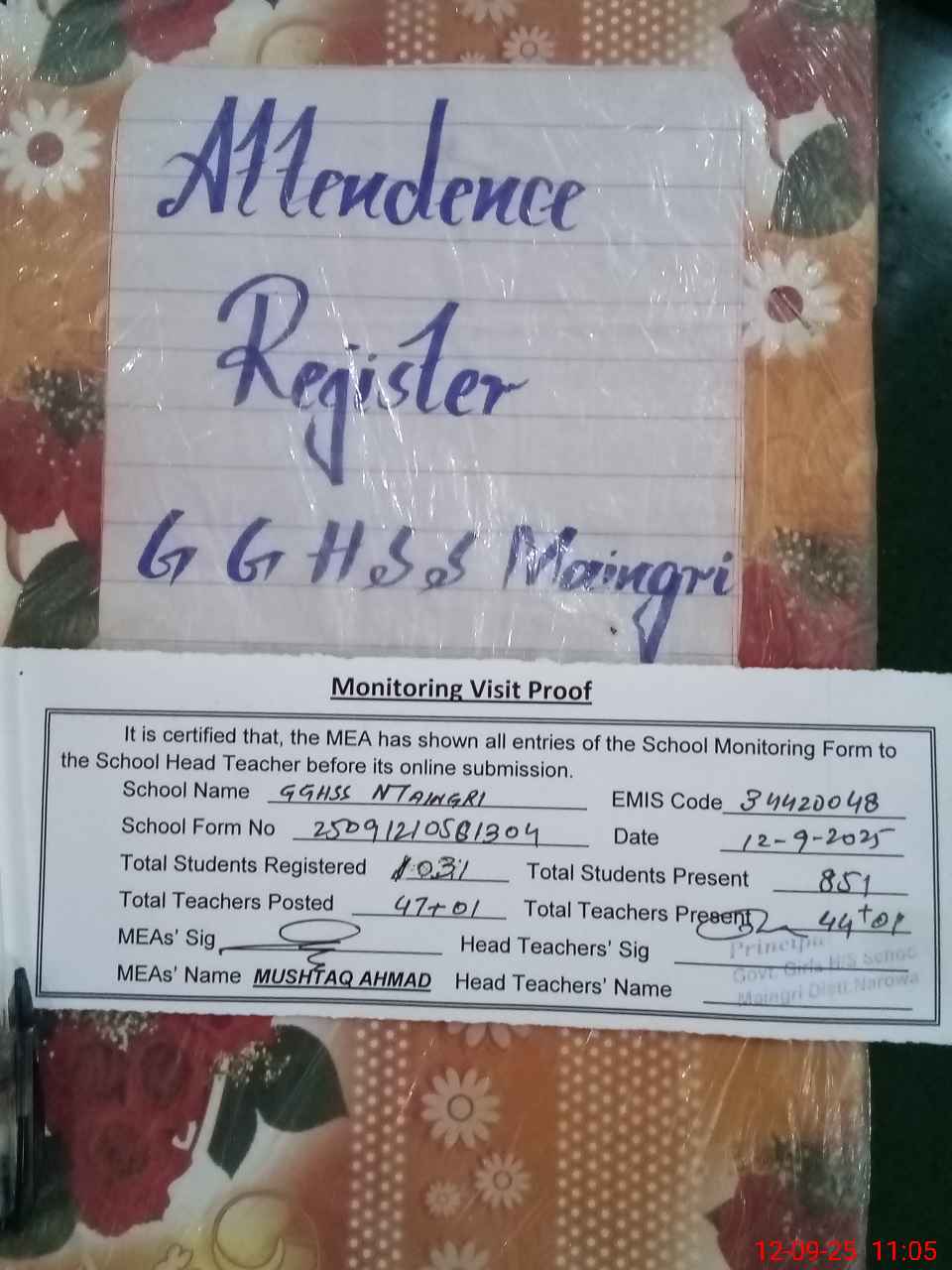 | Attendance Register | Head Teacher | MEA with School | Visit Proof |