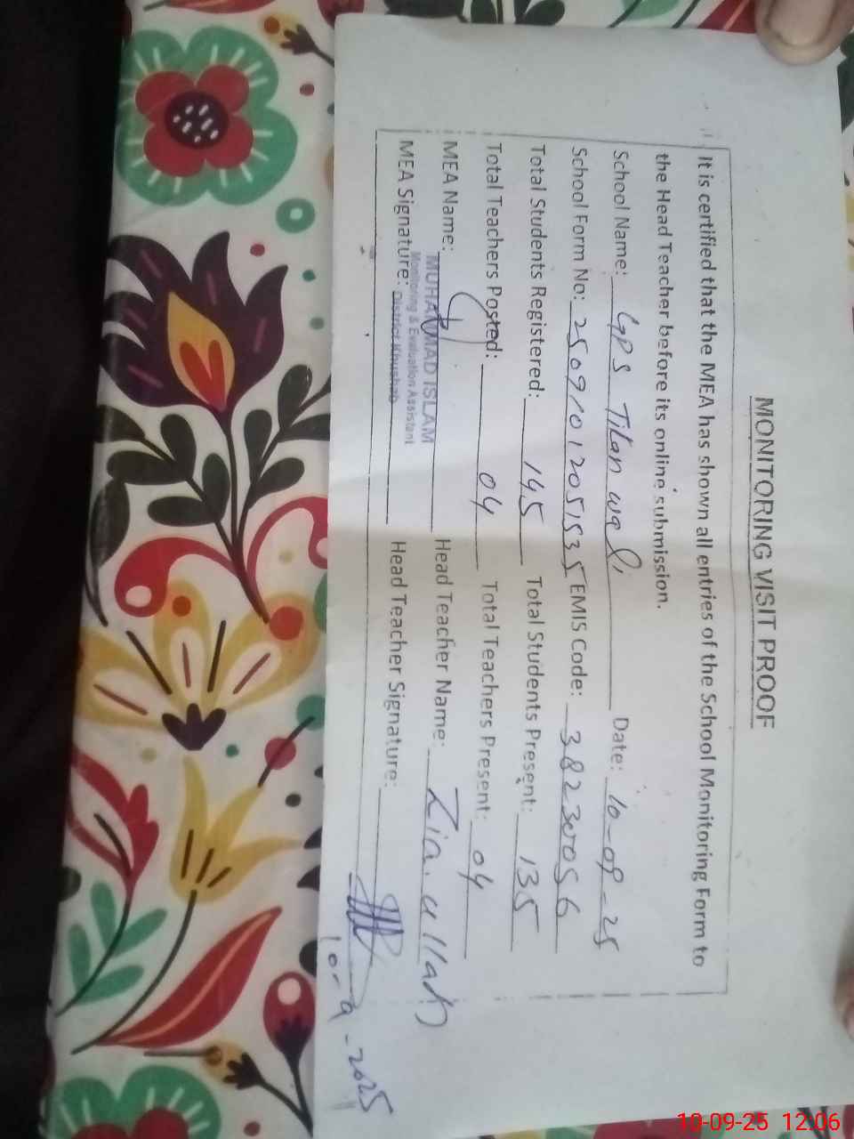 | Certified that this School was Inspected by the Undersigned MEA/DMO Today and the Information Stated Above is as Per Record. | |||||