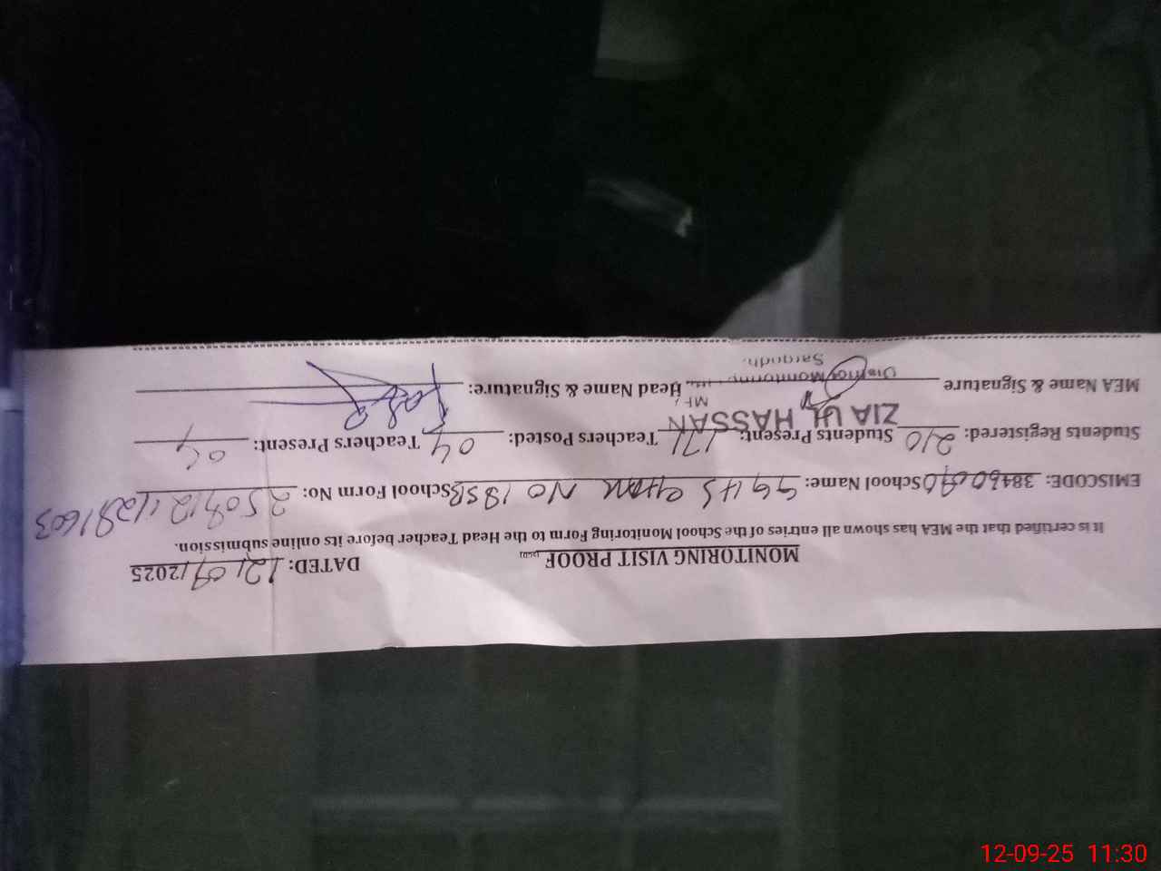| Monitoring Date: 12-09-2025 | Start Time: 12-09-2025 11:00 AM | End Time: 12-09-2025 11:31 AM | Name of MEA: ZI**** ULHA**** | |