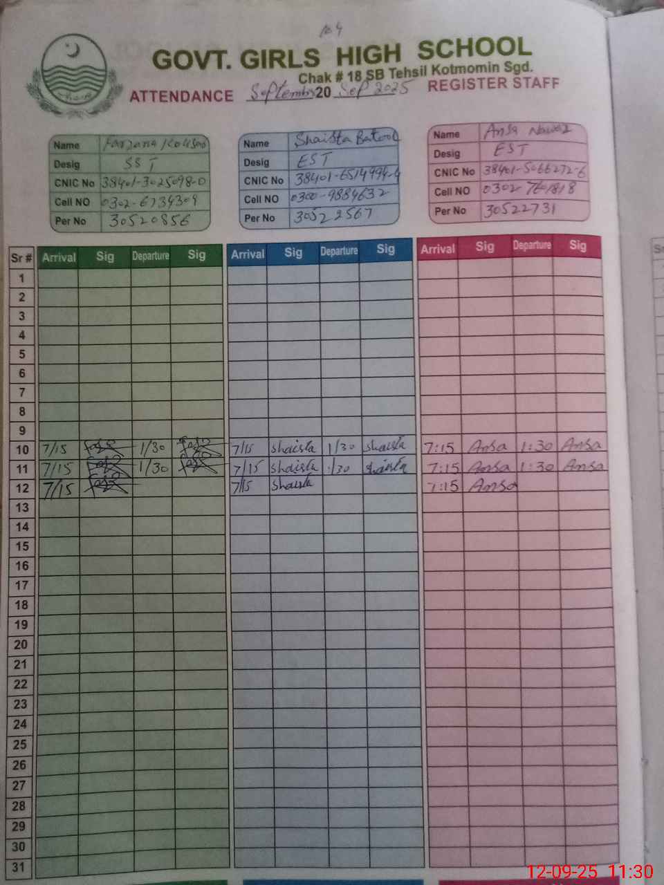 | CNIC | Full Name | Designation | R/C | Absence during last cal. month |