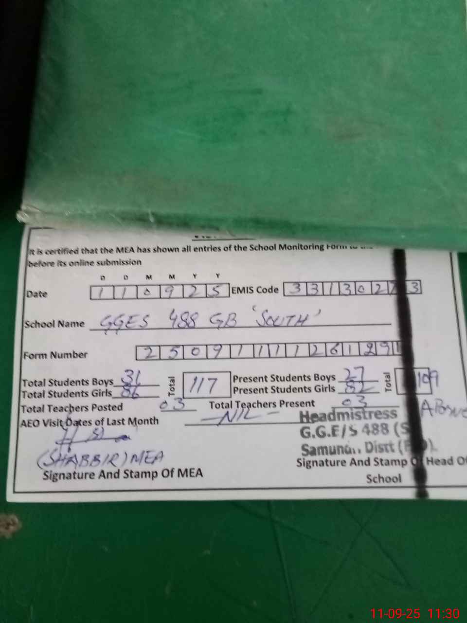 | EMIS Code: 33130273 | Name of School: GGES CHAK 488 GB SOUTH MAMUNKANJAN | |||