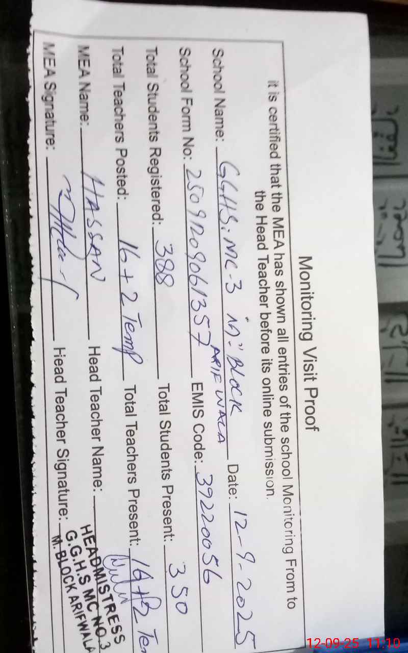 | EMIS Code: 39220056 | Name of School: GGHS MC NO.3 M BLOCK ARIFWALA | |||