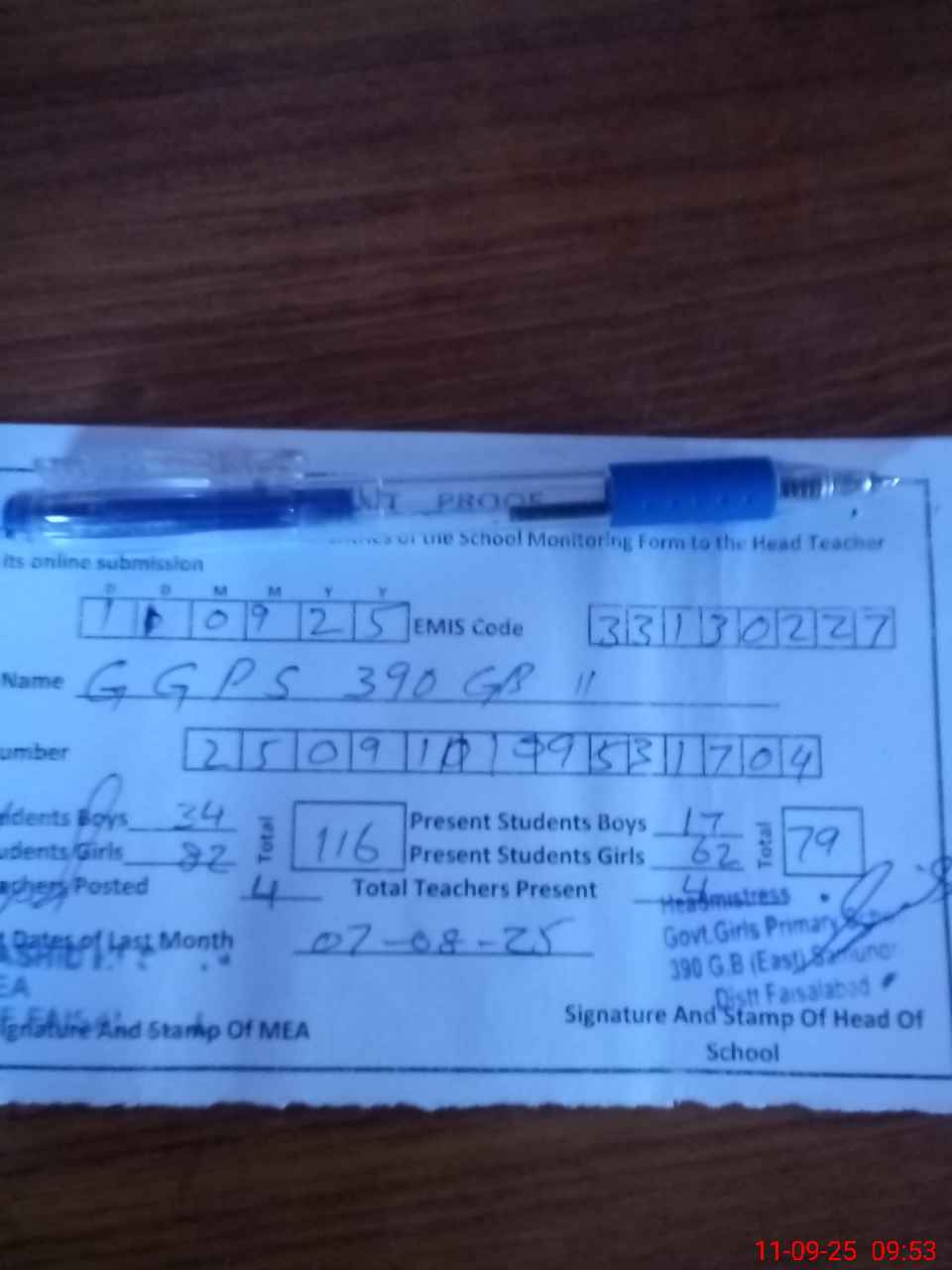 | Attendance Register | Head Teacher | MEA with School | Visit Proof |
