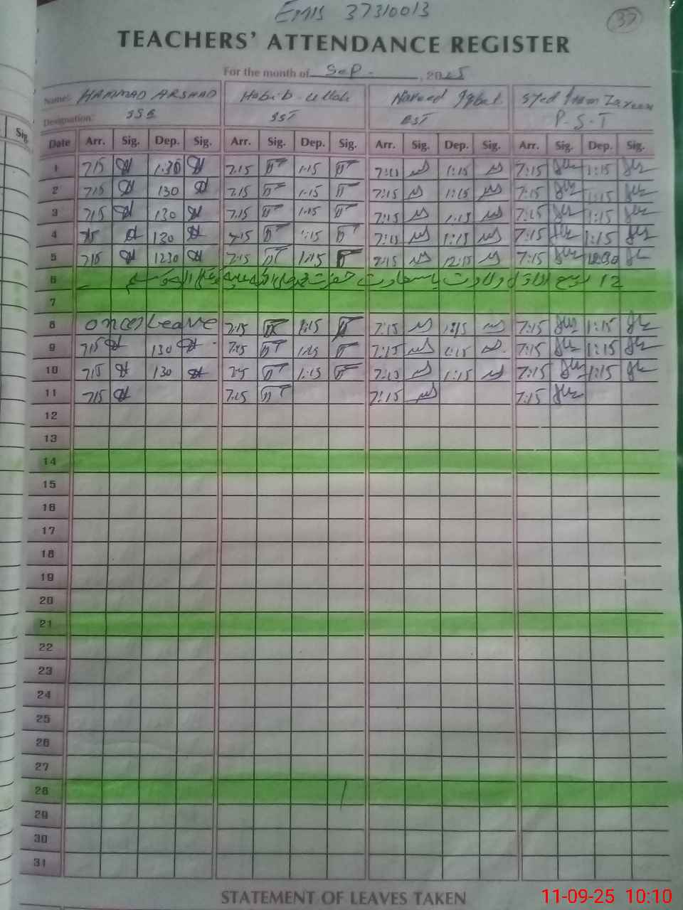 | CNIC | Full Name | Designation | R/C | Absence During Last Calender Month |