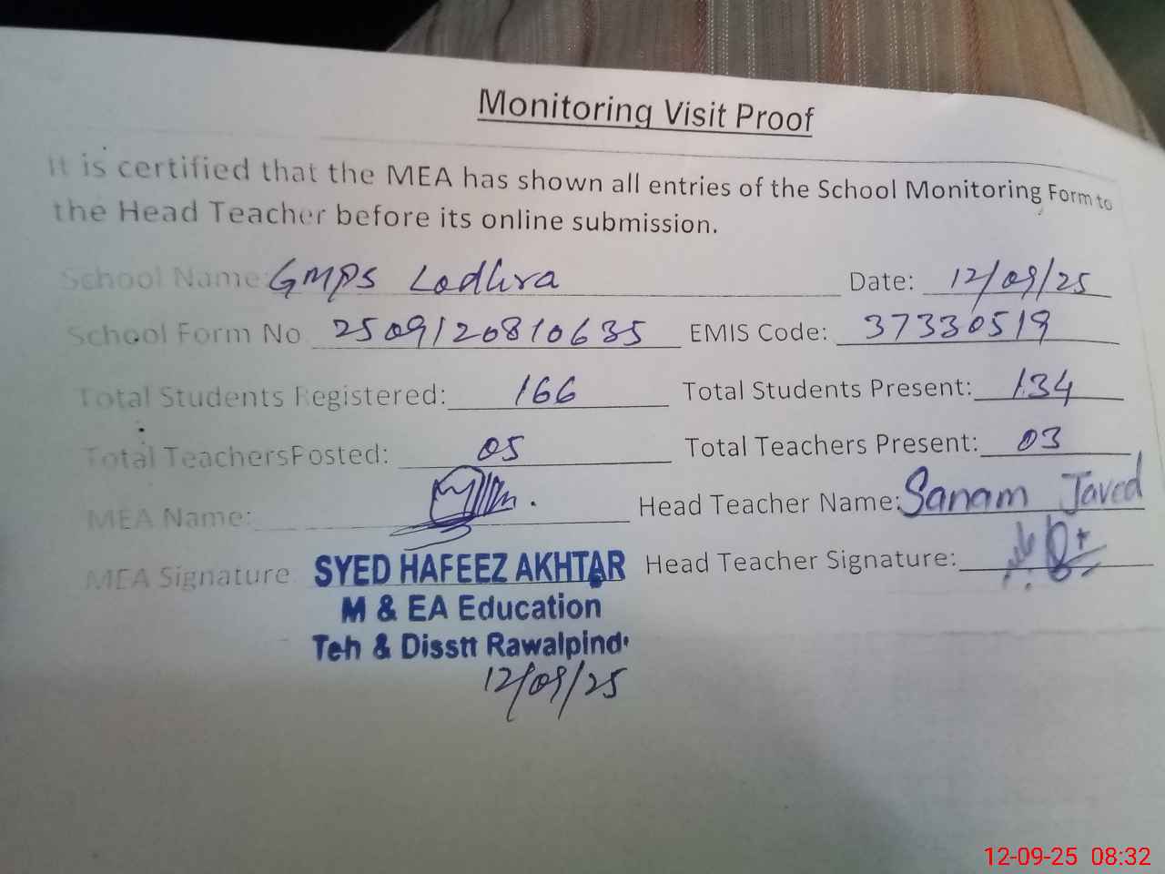 | Attendance Register | Head Teacher | MEA with School | Visit Proof |