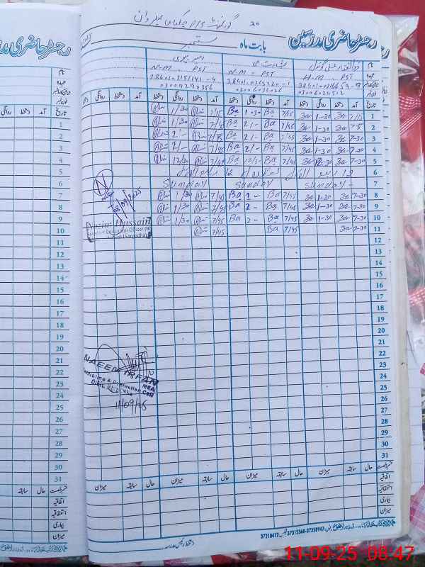 | Remarks (Use Separate Page if Required): Visit the school on 11 September 2025 Daily rooznamcha not maintained Overall school and classrooms cleaning not satisfactory Documents condition deteriorated | |||||