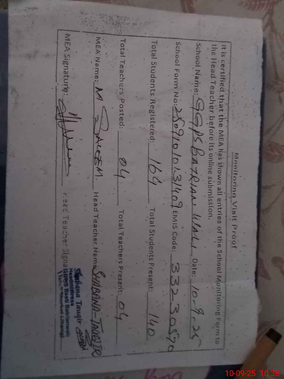 | Certified that this School was Inspected by the Undersigned MEA/DMO Today and the Information Stated Above is as Per Record. | |||||