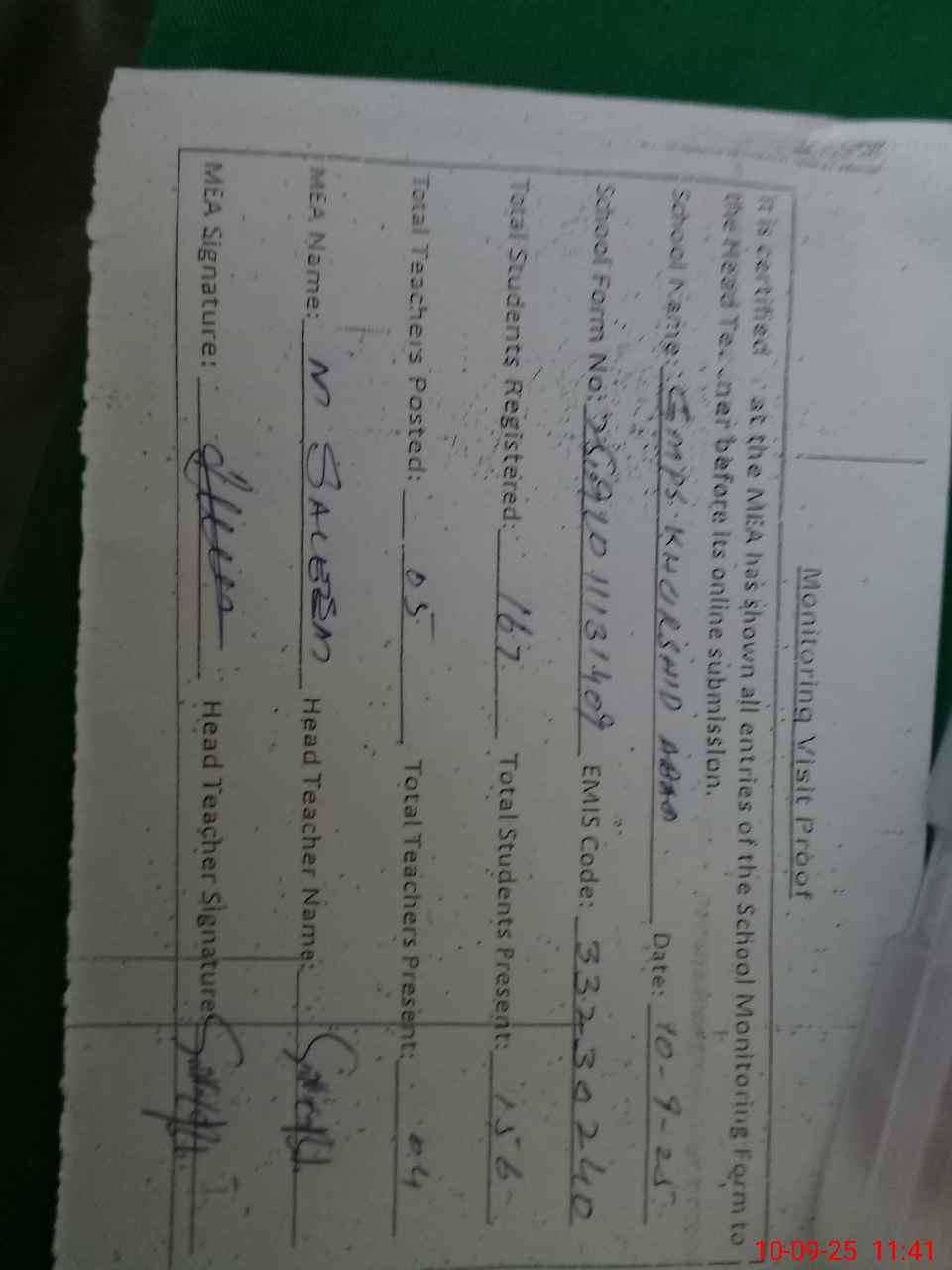 | Attendance Register | Head Teacher | MEA with School | Visit Proof |