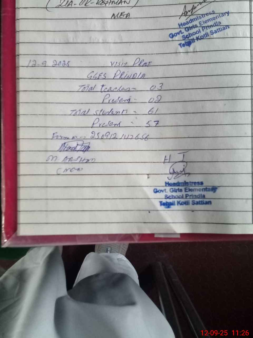 | Attendance Register | Head Teacher | MEA with School | Visit Proof |