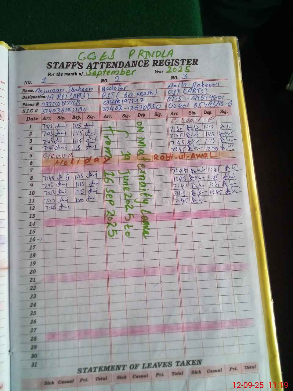 | CNIC | Full Name | Designation | R/C | Absence during last cal. month |