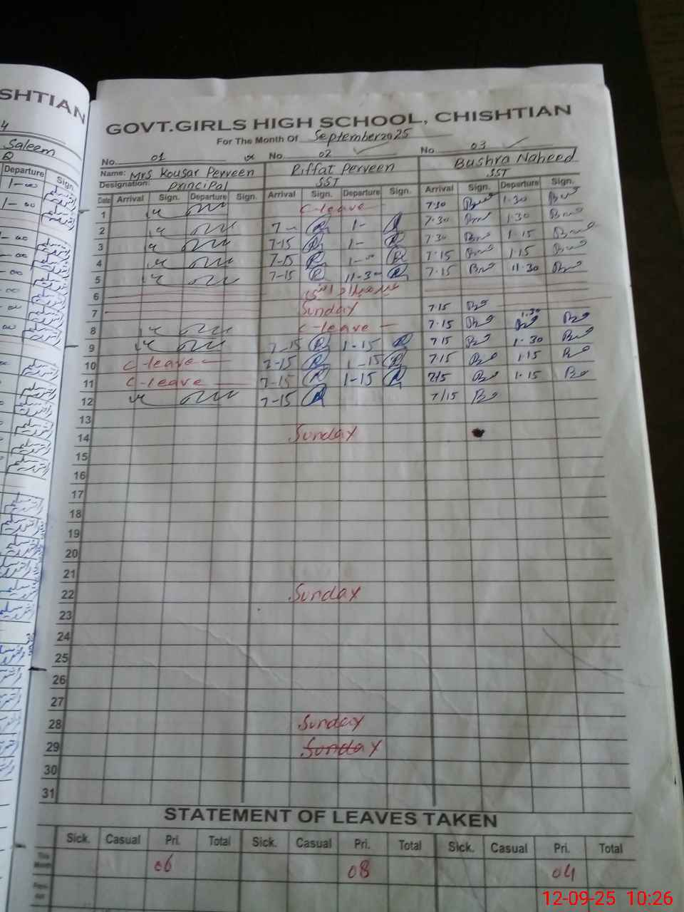 | Remarks (Use Separate Page if Required): The name of teacher Kousar Parveen is not in tab list because of QR code and she is present and Ali Asadullah J C is on internal duty here and he is present and teacher Nayyab Sahar Est is absent from school from 01June 2025 to till date and there is no approved leave of teacher Farzana Parveen on sis or hrm from 02 Sep 2025 to till date and also no approved leave of teacher Samina Naz on sis or hrm from 10 Sep 2025 to till date | |||||