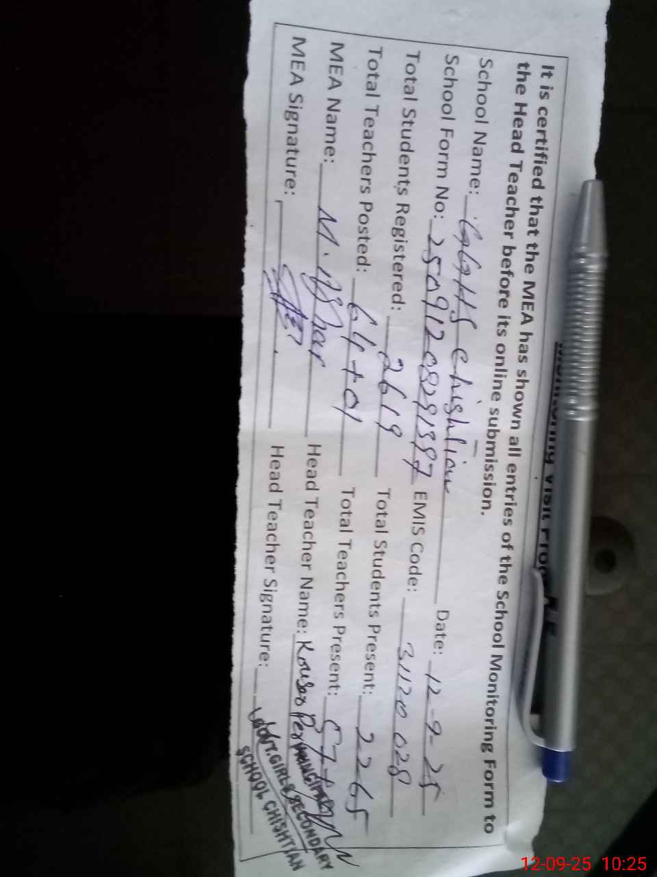 | Attendance Register | Head Teacher | MEA with School | Visit Proof |