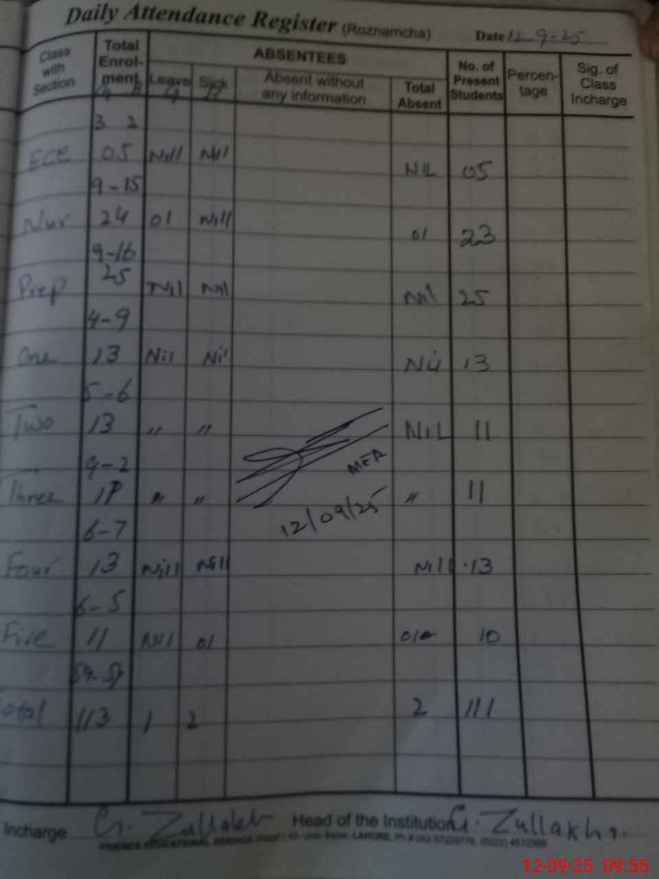 | Total Students Present | 5 | 0 | 48 | 13 | 11 | 11 | 13 | 10 | 111 | |||||||