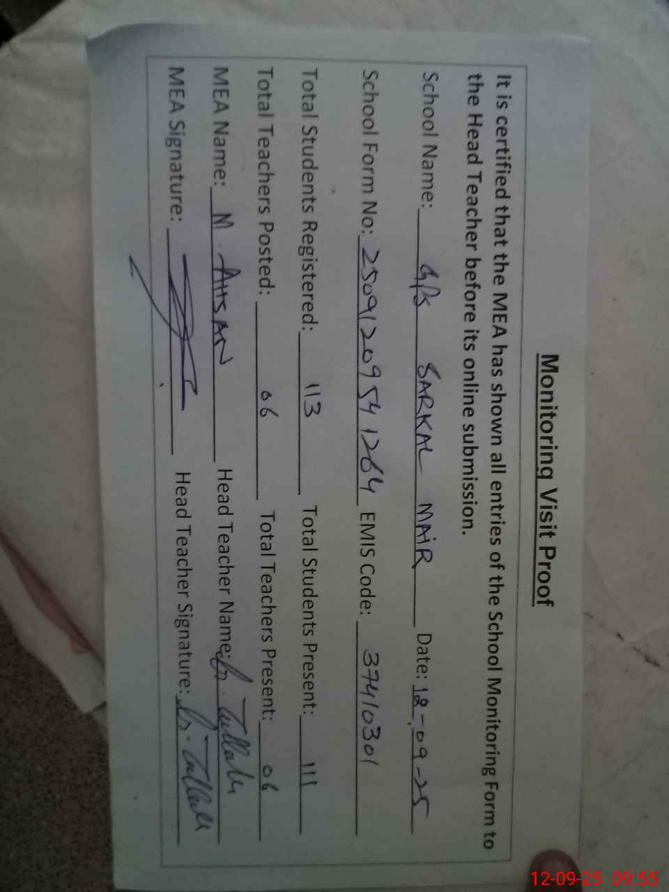 | Attendance Register | Head Teacher | MEA with School | Visit Proof |