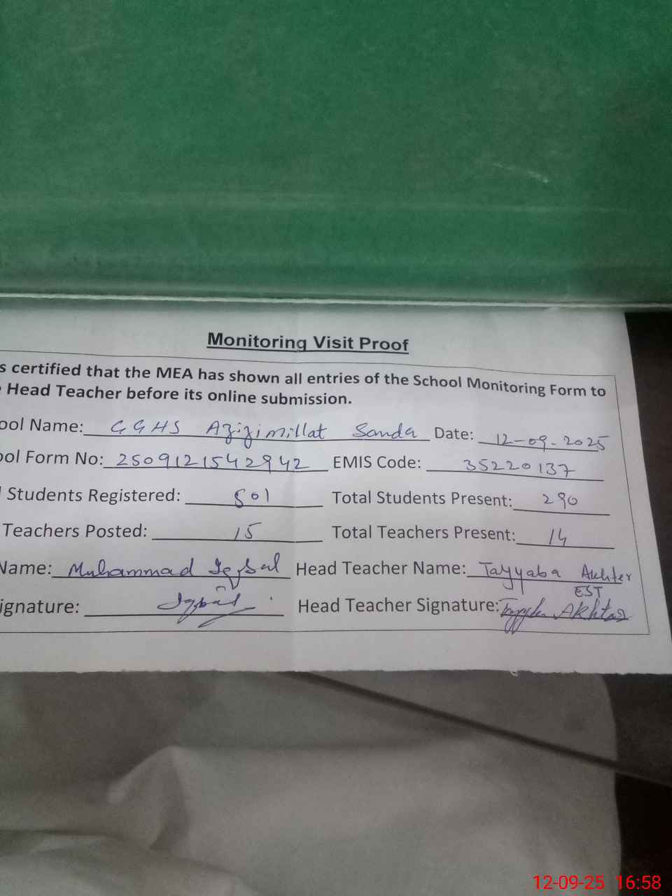 | EMIS Code: 35220137 | Name of School: GGHS AZIZ-I-MILLAT SANDA (Newly Upgraded) | |||