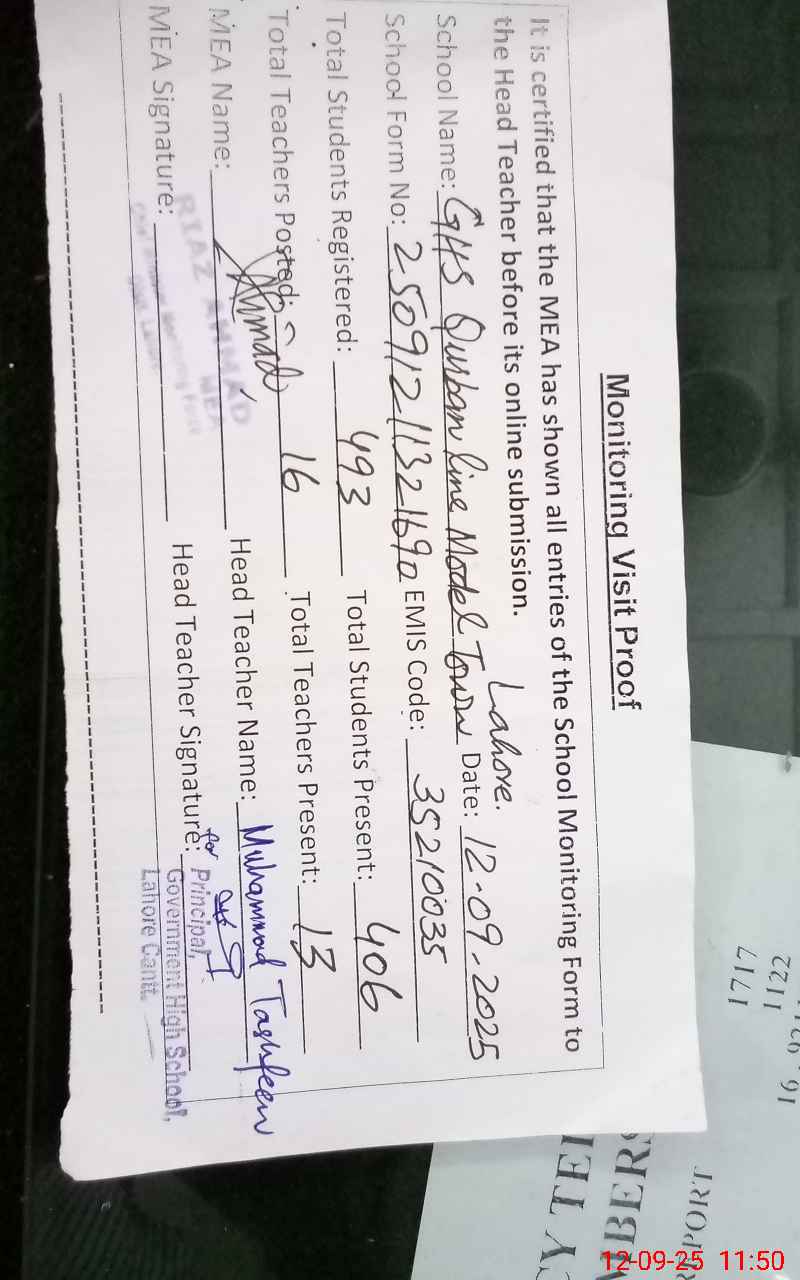 | EMIS Code: 35210035 | Name of School: GHS QURBAN LINE TEHSIL MODE TOWN | |||