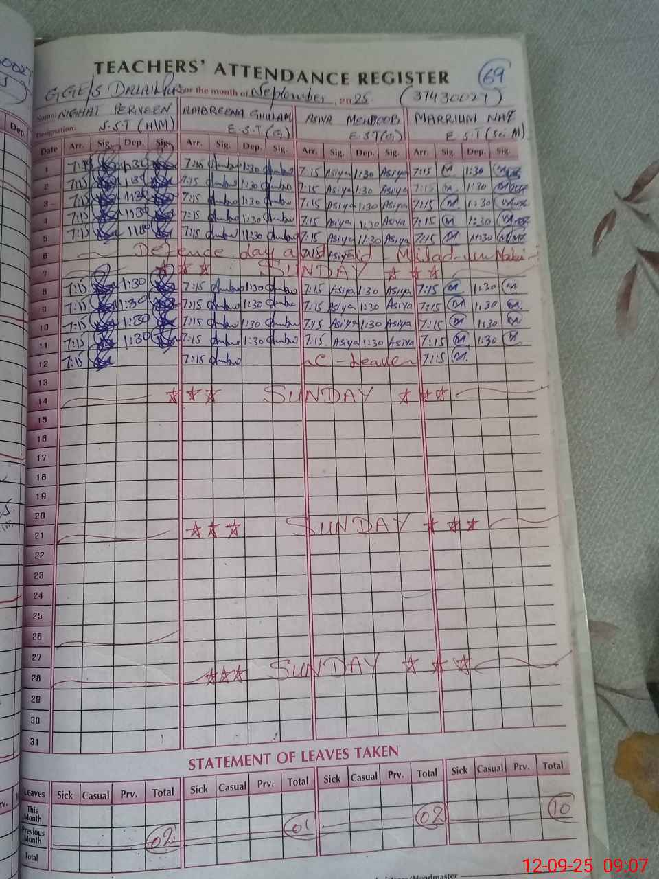 | No. of Students Present - Male | 10 | 0 | 12 | 12 | 10 | 11 | 9 | 5 | 0 | 0 | 0 | 69 | ||||