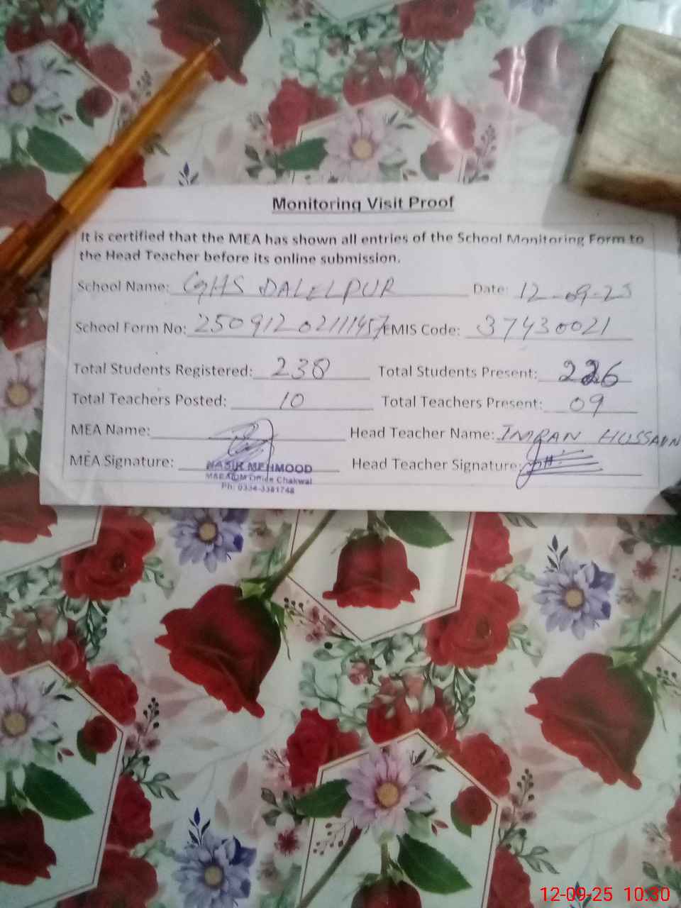 | Attendance Register | Head Teacher | MEA with School | Visit Proof |