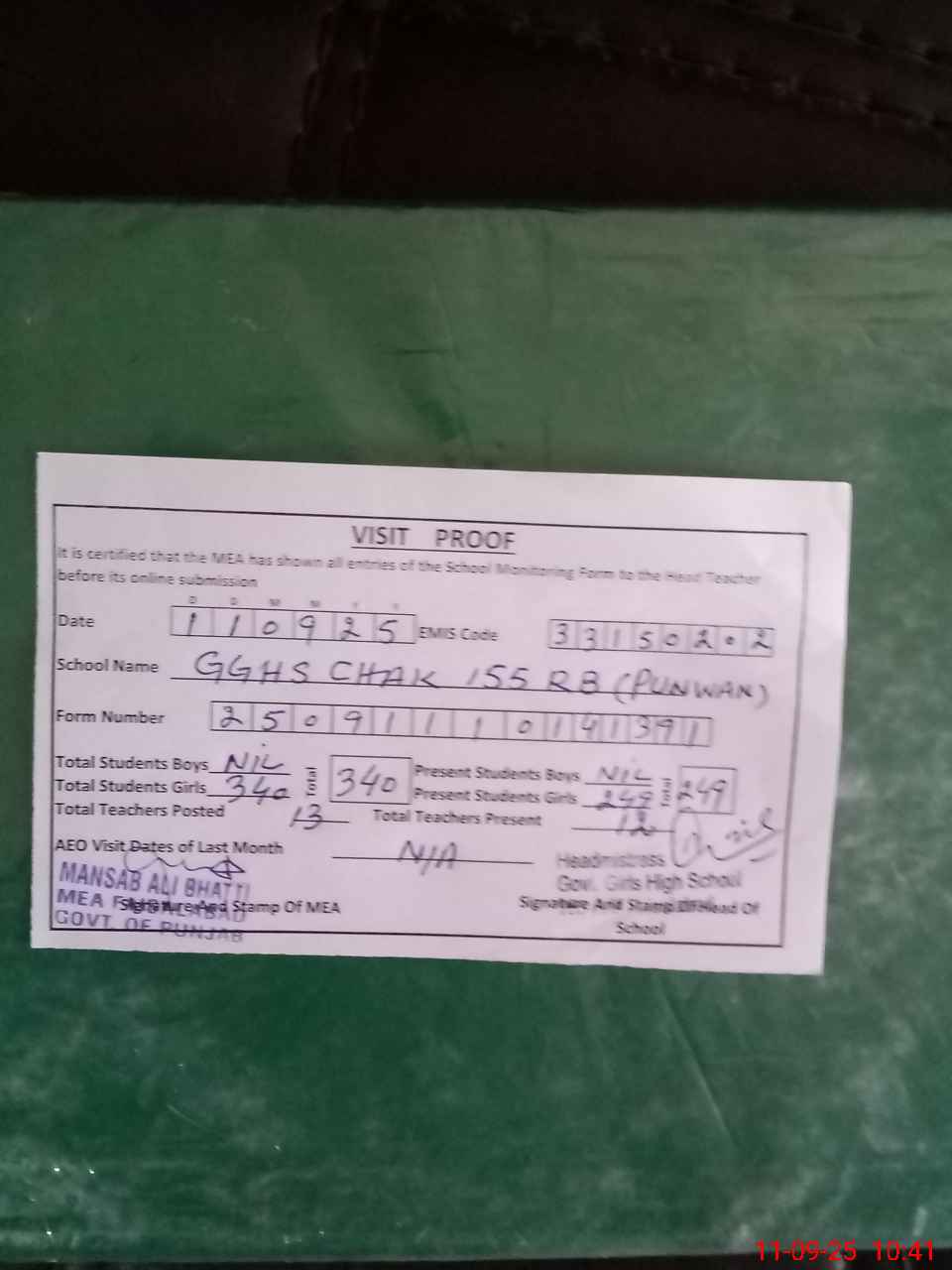 | EMIS Code: 33150202 | Name of School: GGHS CHAK 155 RB PUNWAN | |||