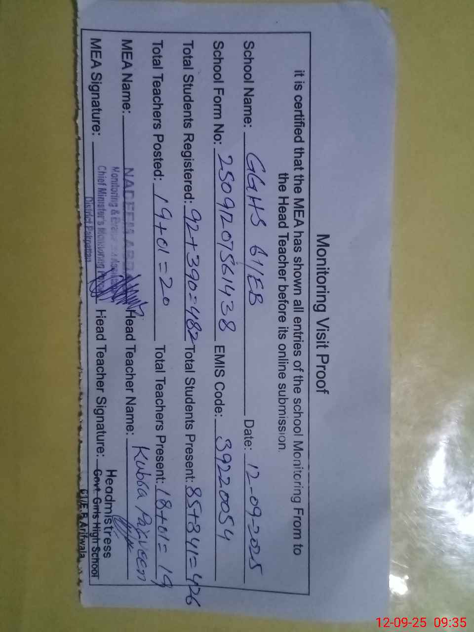 | Attendance Register | Head Teacher | MEA with School | Visit Proof |