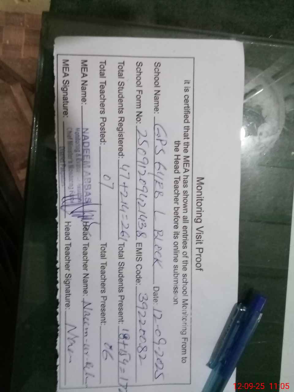 | Attendance Register | Head Teacher | MEA with School | Visit Proof |