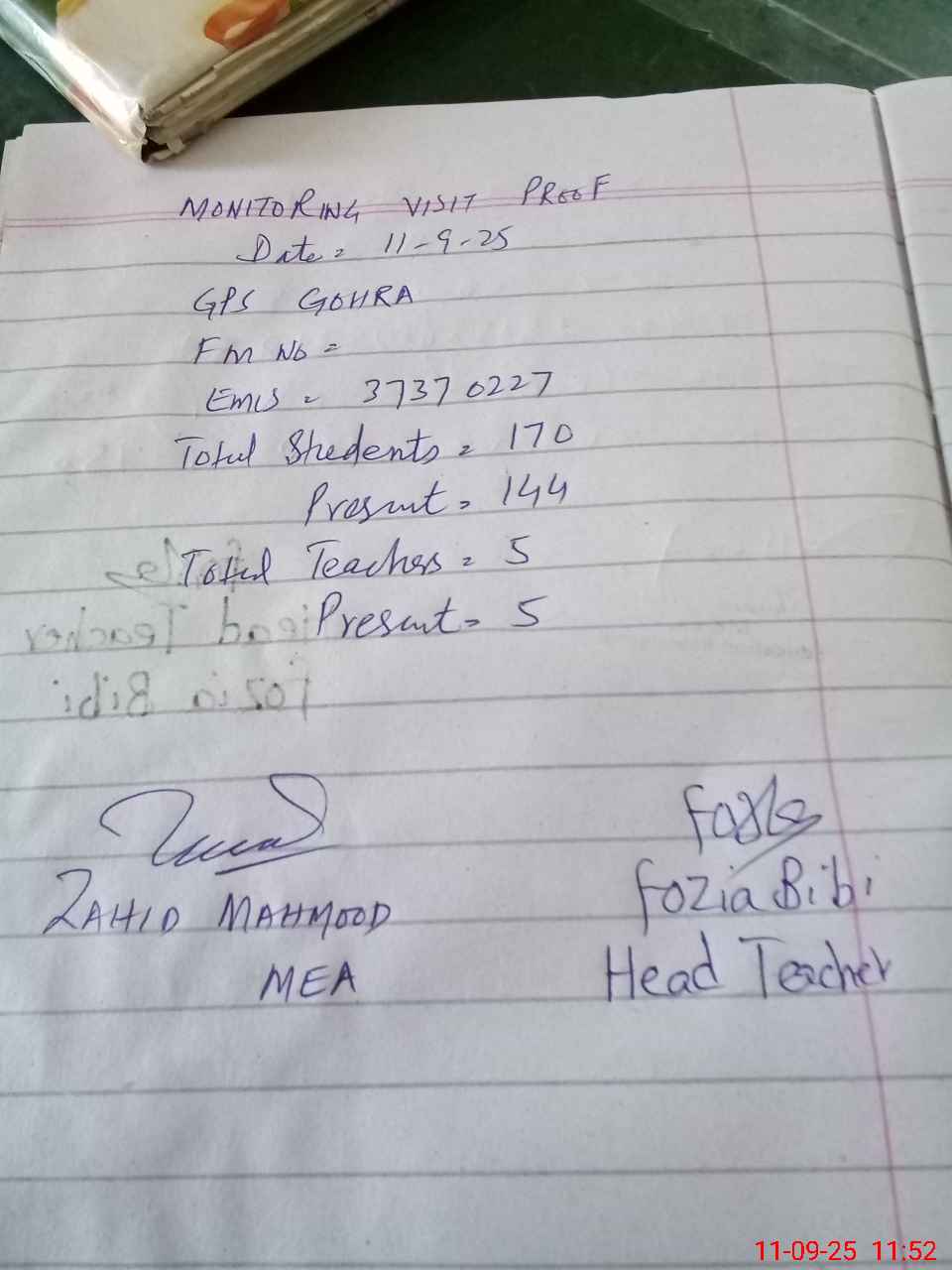 | Attendance Register | Head Teacher | MEA with School | Visit Proof |