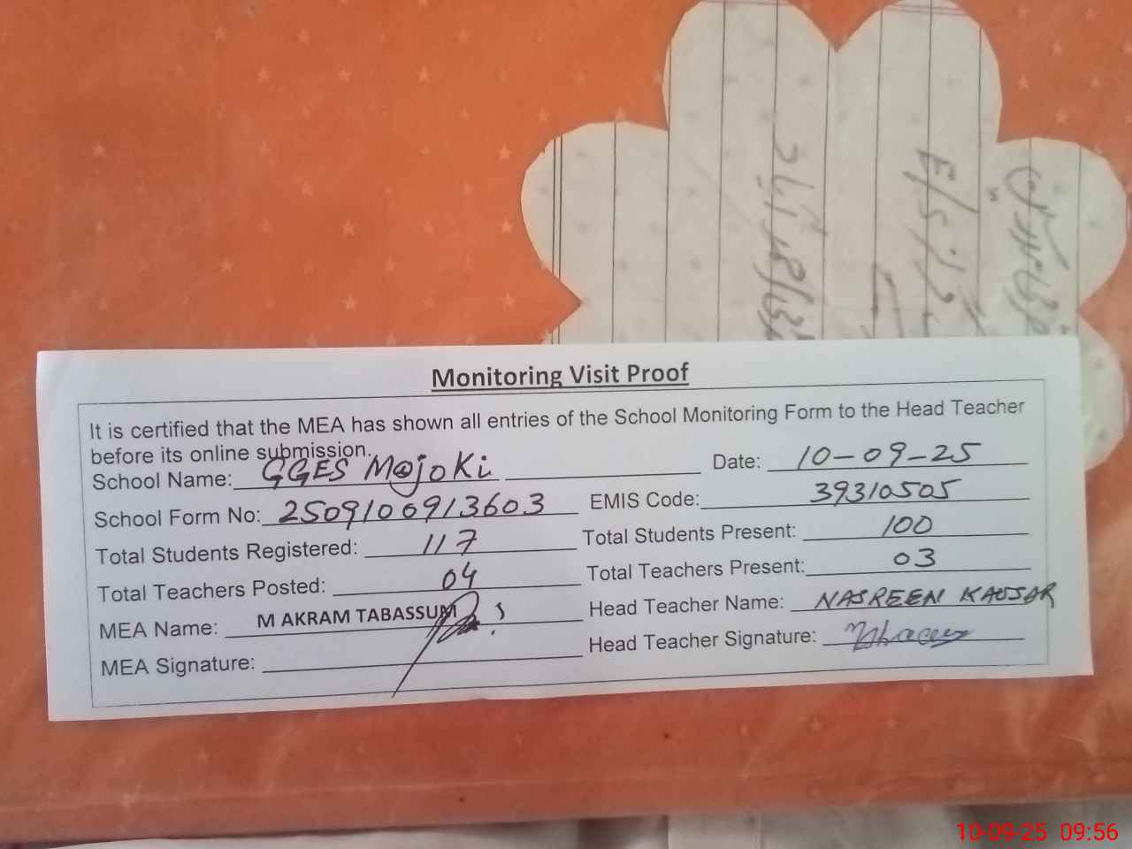 | Certified that this School was Inspected by the Undersigned MEA/DMO Today and the Information Stated Above is as Per Record. | |||||
