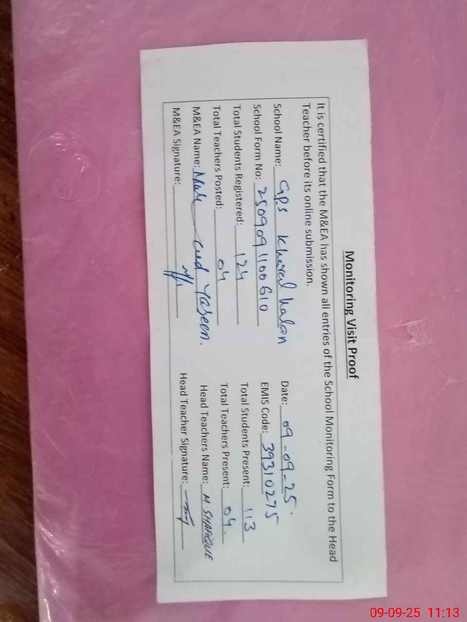 | Name: MU**** SH**** Designation: (School Headmaster's/Headmistress's) PST/ Phone/Cell Number: 03**** |