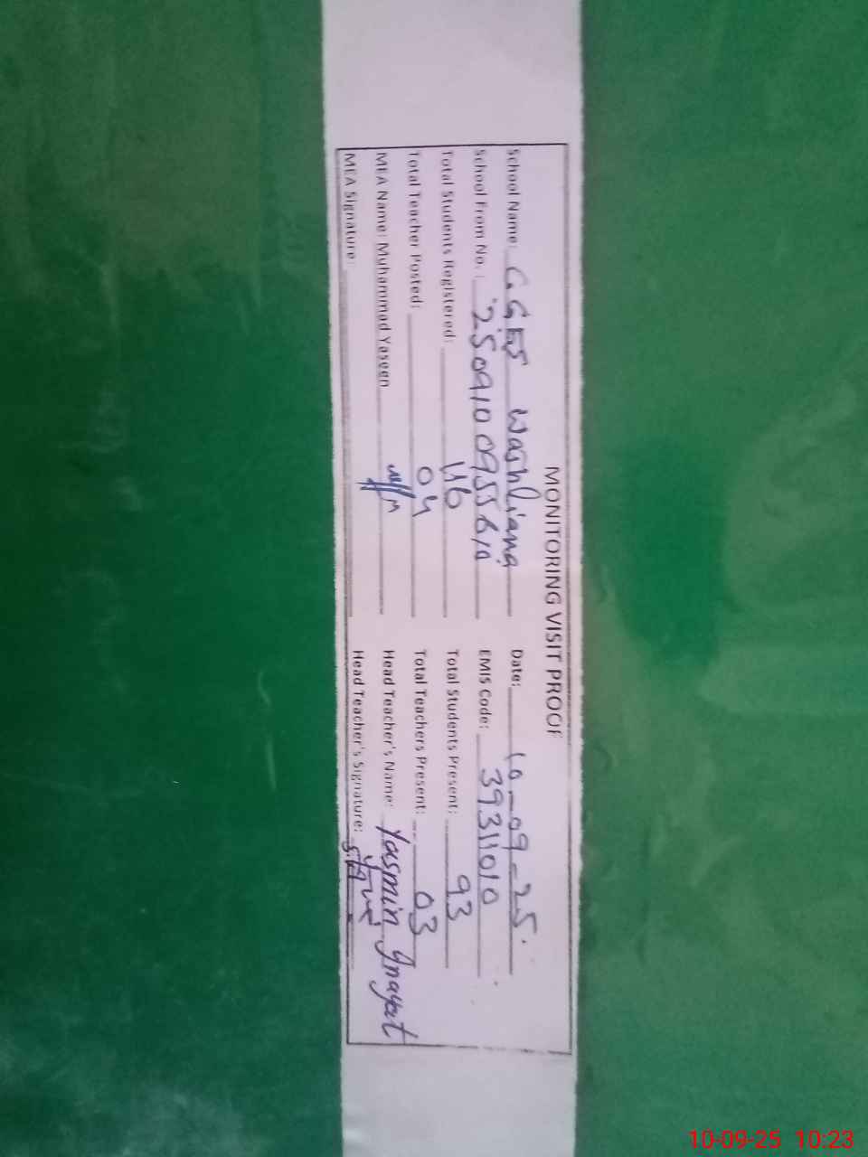 | Attendance Register | Head Teacher | MEA with School | Visit Proof |
