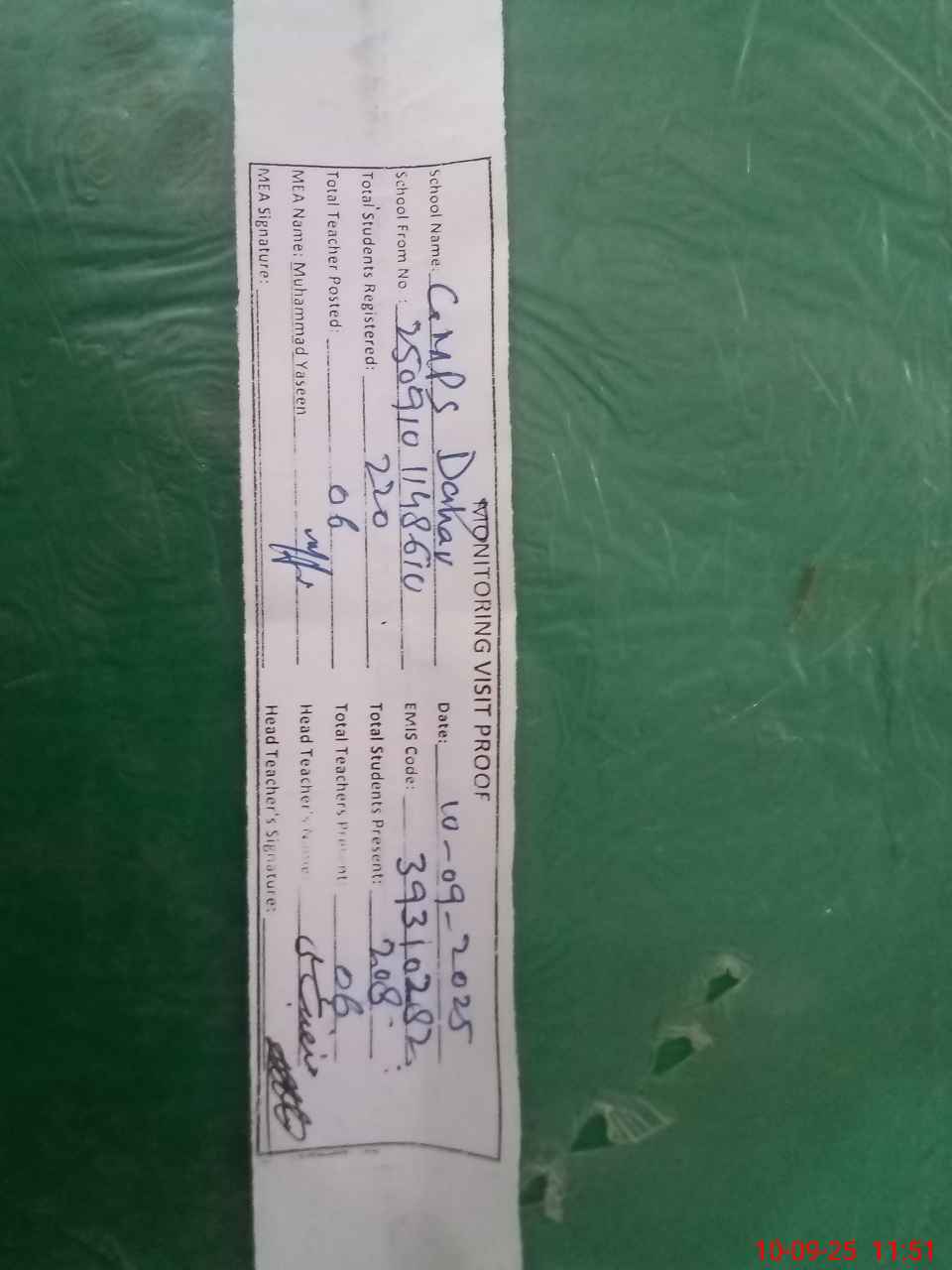 | Attendance Register | Head Teacher | MEA with School | Visit Proof |