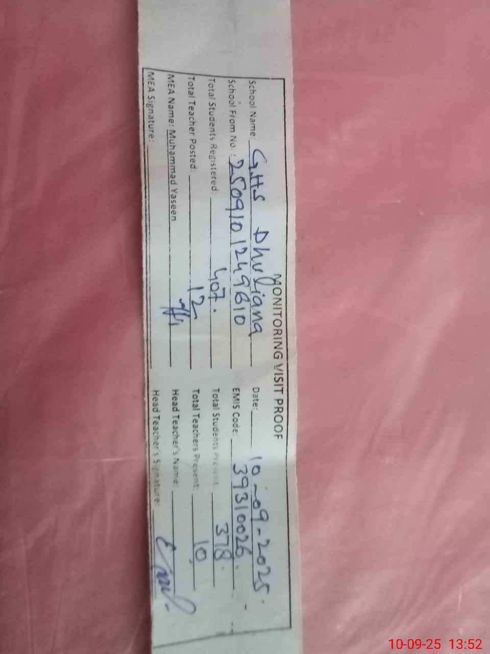 | Certified that this School was Inspected by the Undersigned MEA/DMO Today and the Information Stated Above is as Per Record. | |||||