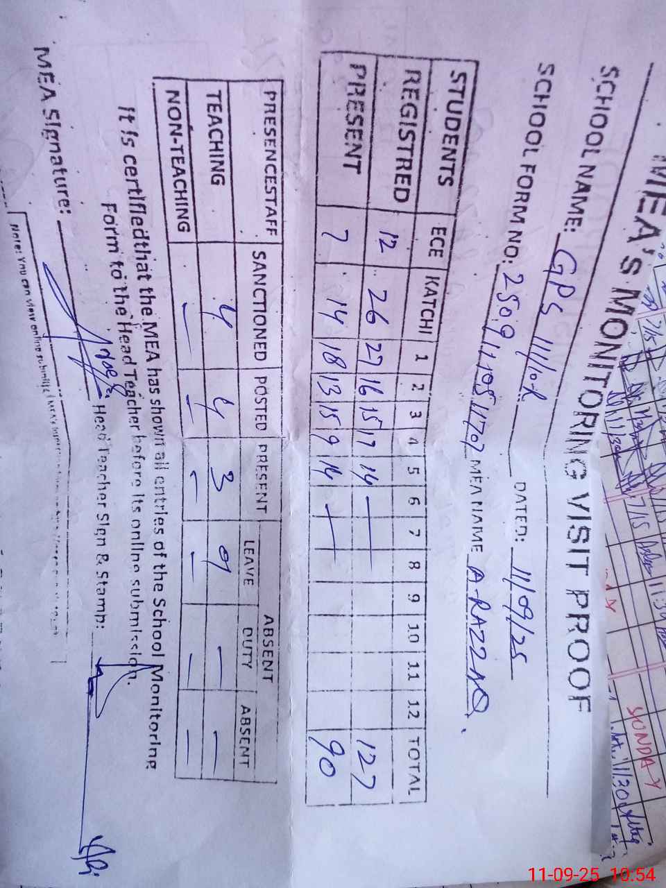 | Attendance Register | Head Teacher | MEA with School | Visit Proof |