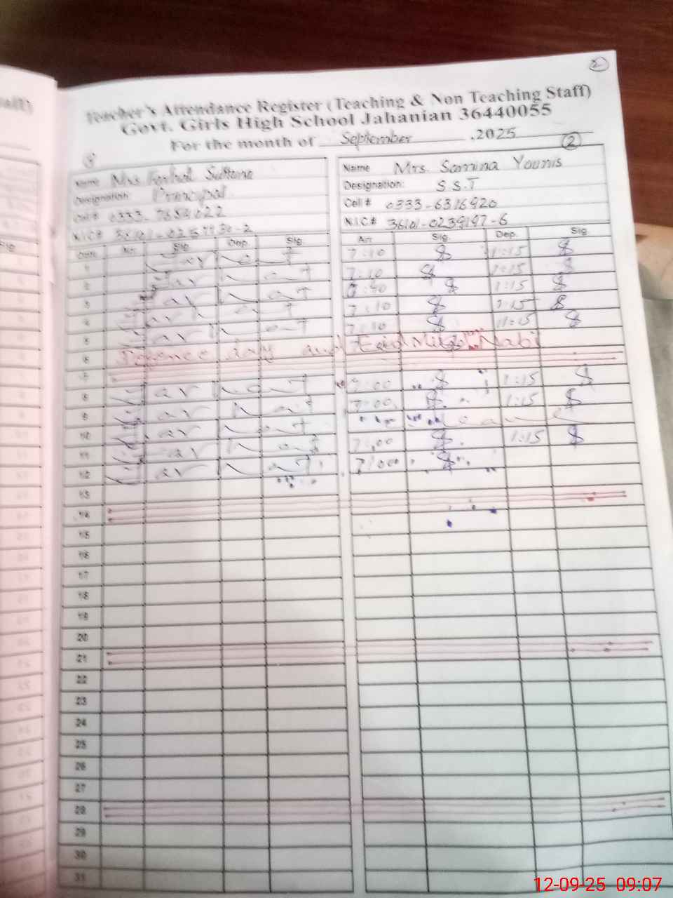| CNIC | Full Name | Designation | R/C | Absence During Last Calender Month |