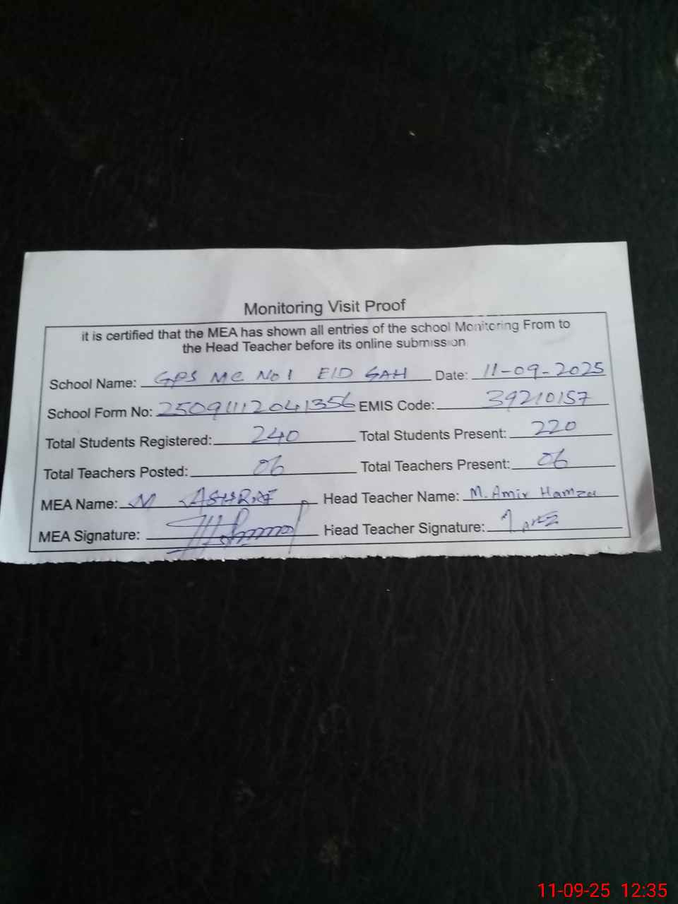 | Attendance Register | Head Teacher | MEA with School | Visit Proof |