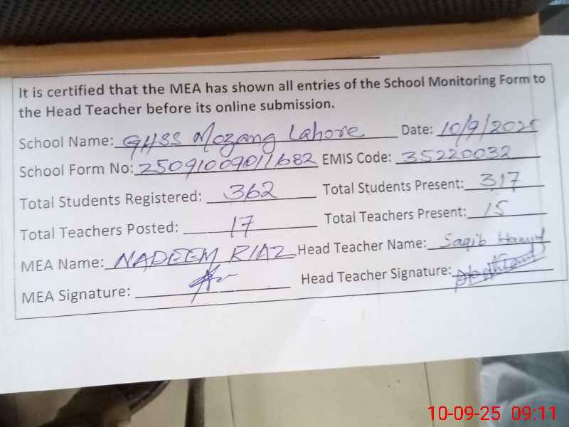 | EMIS Code: 35220032 | Name of School: GHSS MOZANG LAHORE | |||