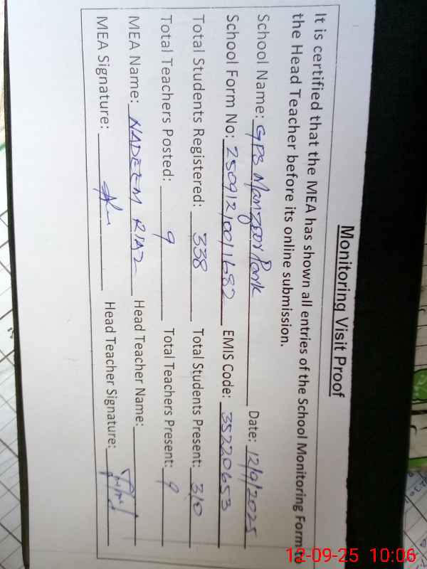 | EMIS Code: 35220653 | Name of School: GPS MANZOOR PARK BUND ROAD SHAFIQUE ABAD | |||