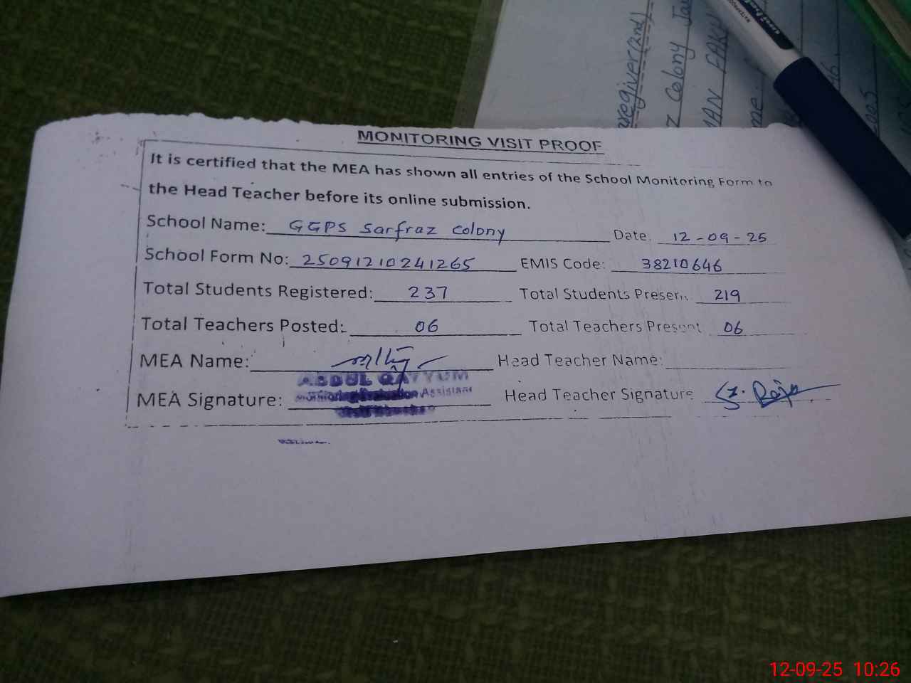 | Attendance Register | Head Teacher | MEA with School | Visit Proof |
